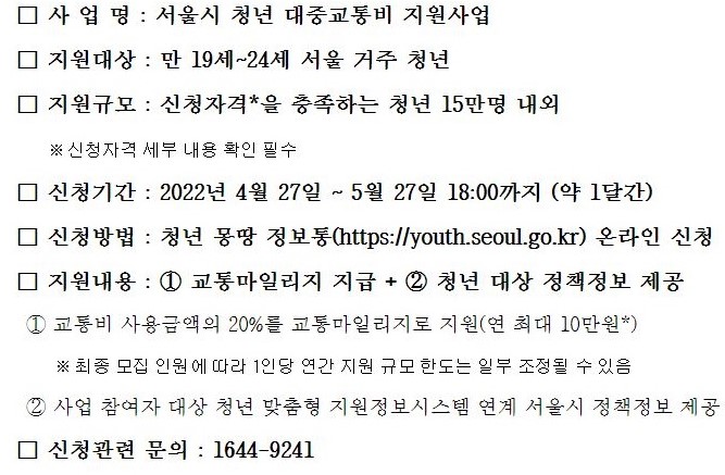 경제적 부담 완화 및 이동권 보장을 위해 교통비를 지원하는 사업