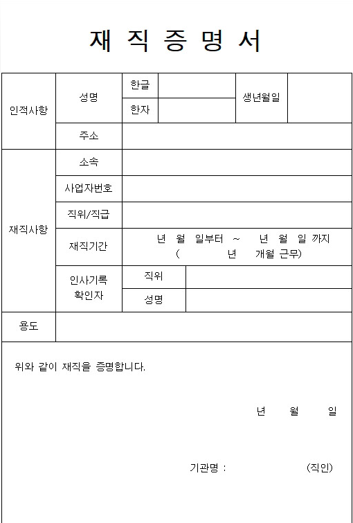 참고로 재직증명서 양식은 딱히 정해진 틀이 없습니다.